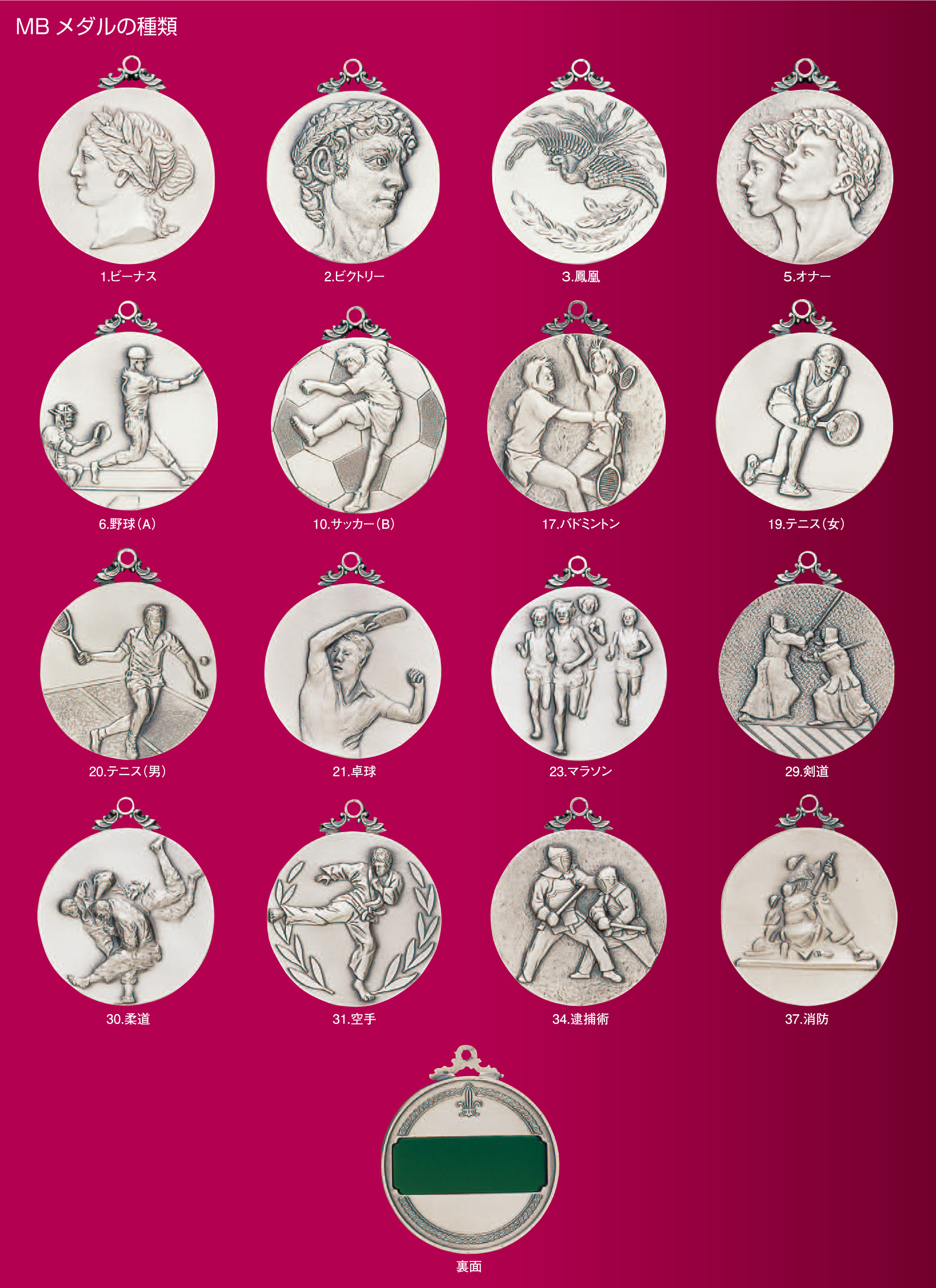 絵柄が選べるメダルです。 定番のビーナスや鳳凰以外にも野球やサッカーなどスポーツの絵柄や柔道や空手などの武道もございます。 お色は金・銀・銅がございます。