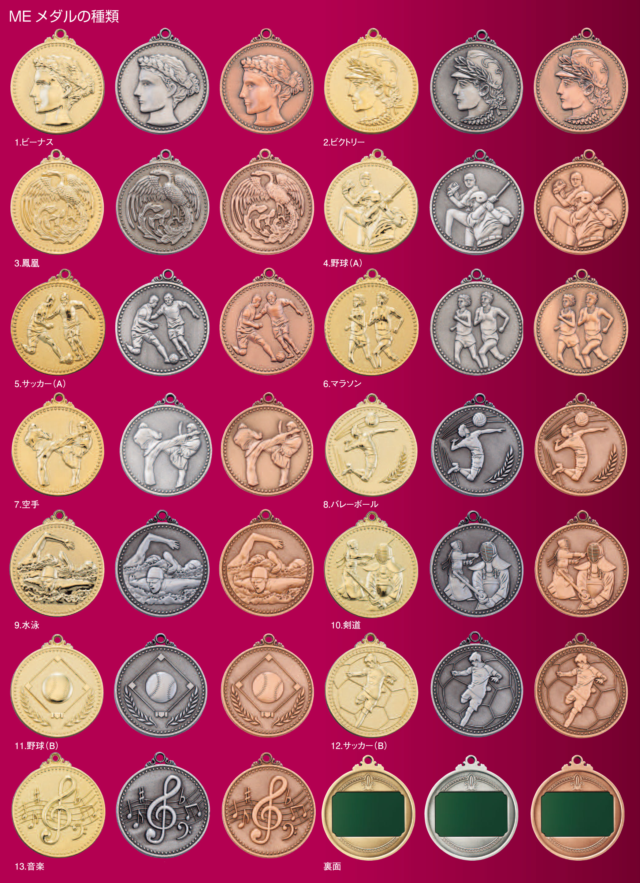 定番のビーナスや鳳凰以外にも野球やサッカーなどスポーツの絵柄や柔道や空手などの武道もお選びいただけます。 お色も金・銀・銅がございます!