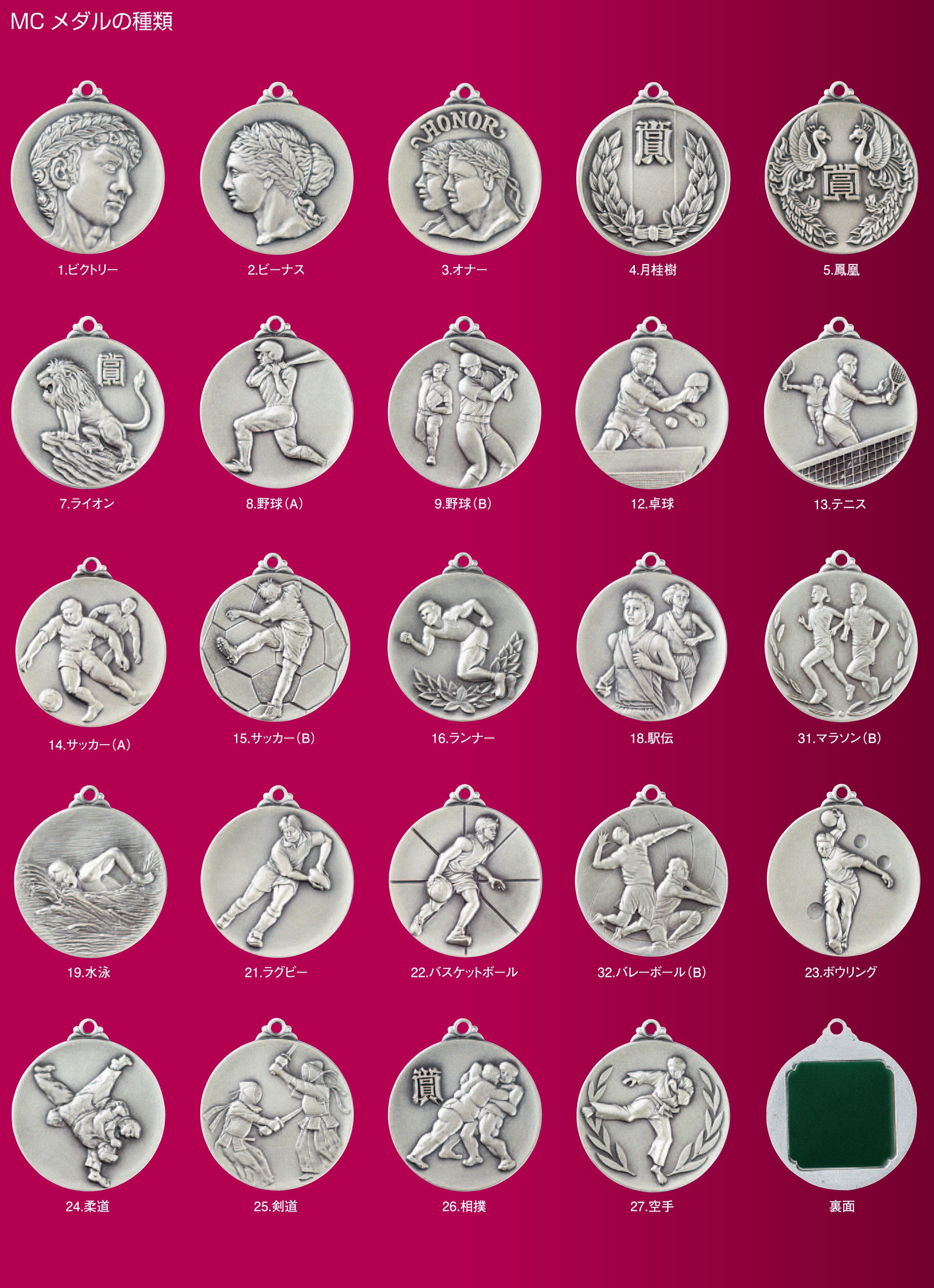 定番のビーナスや鳳凰以外にも野球やサッカーなどスポーツの絵柄や剣道や空手などの武道もお選びいただけます。 お色も金・銀・銅がございます!