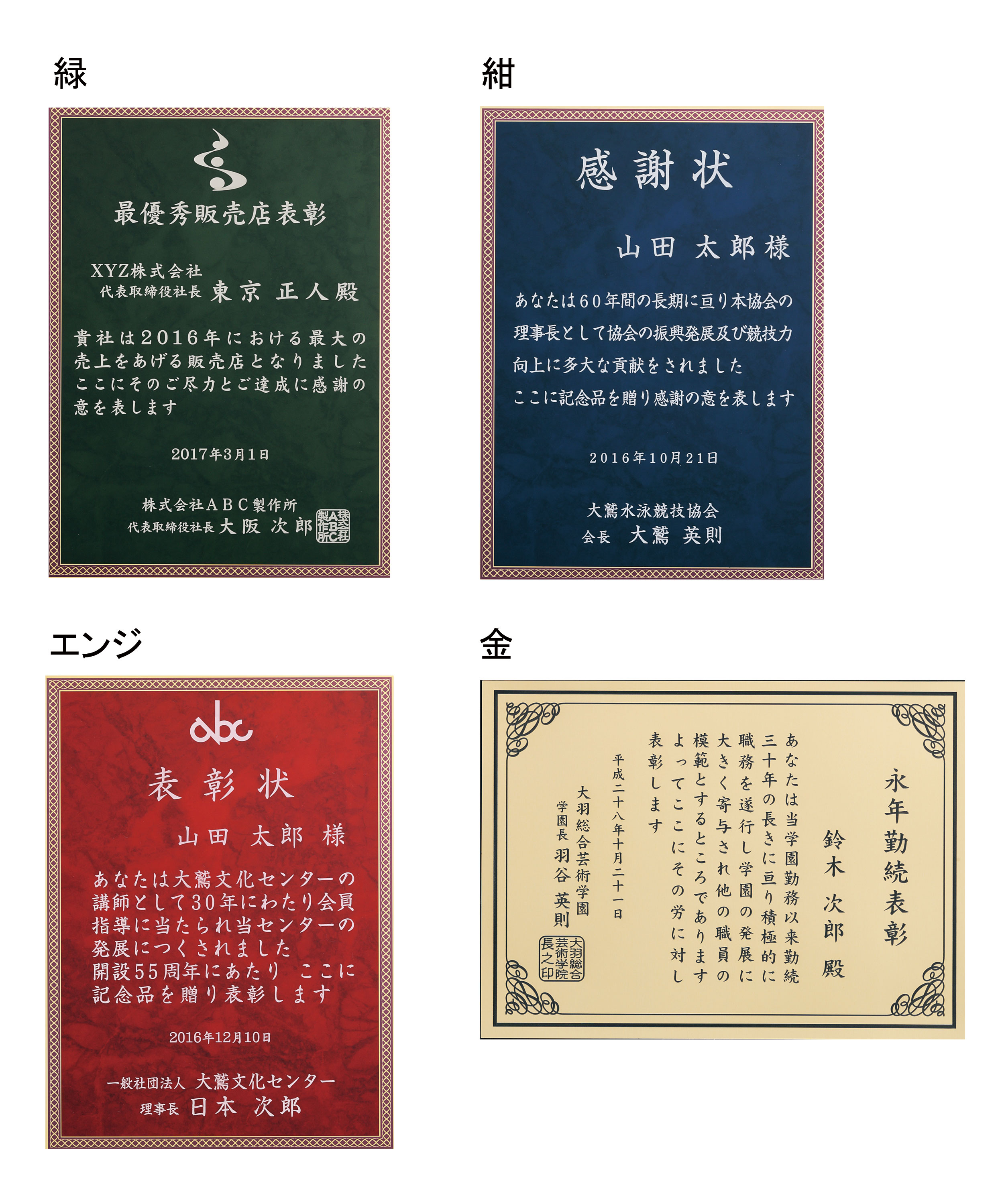 ベースの彫刻プレートは4色(緑・紺・エンジ・金)からお選びいただけます。