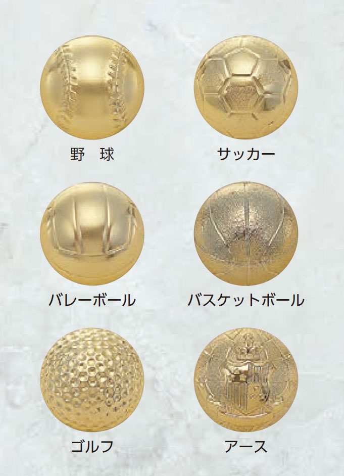 ボールのレリーフは6種類からお選びいただけます。(写真は野球のレリーフです。) お色は金・銀・銅がございますのでお好みの色をご指定ください。