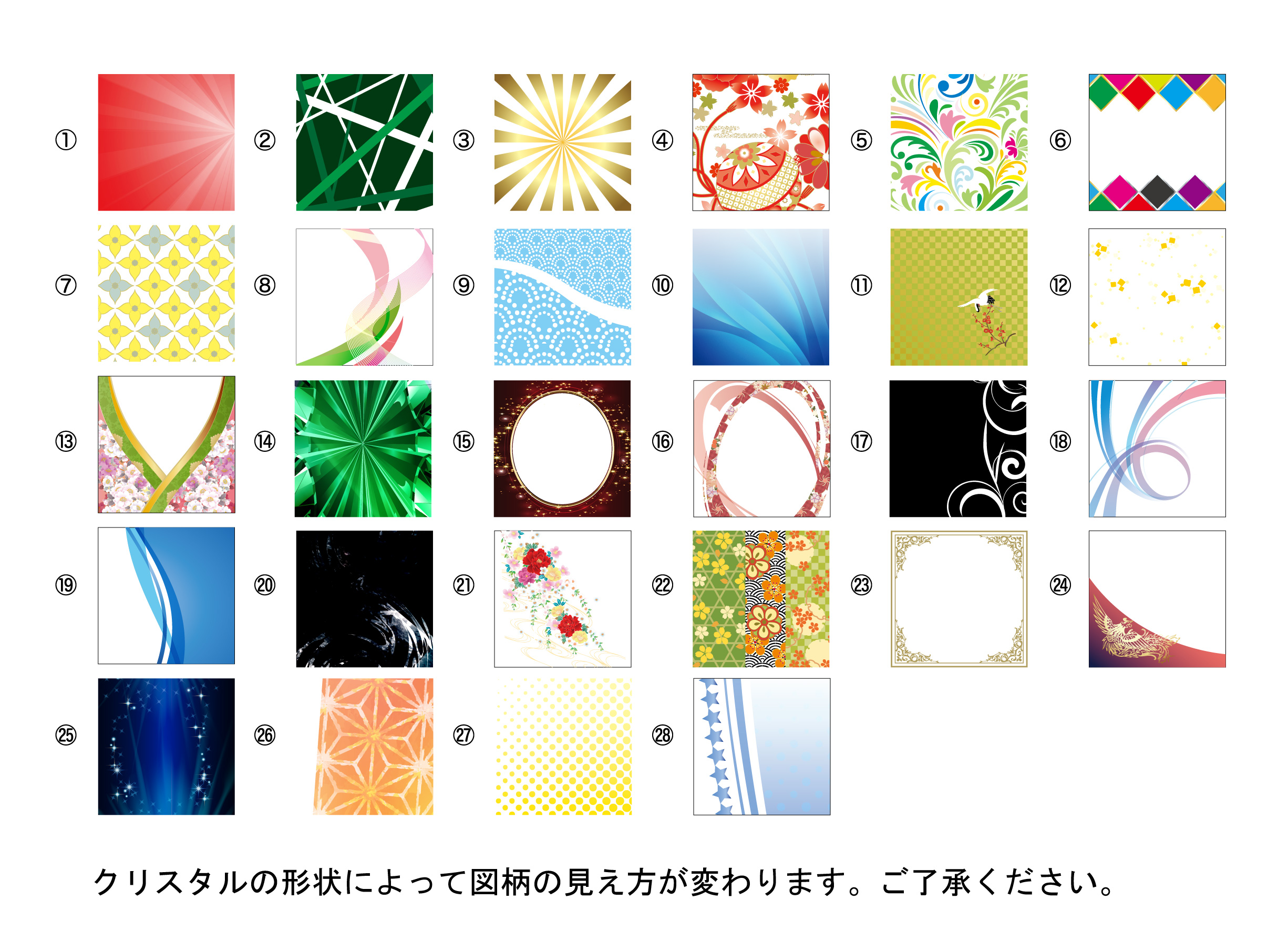 クリスタルの形状により背景の図柄の見え方が変わってきます。